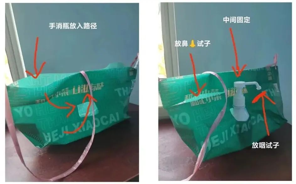 颛桥社区卫生服务中心医务人员制作的单采核酸“实用”包包,可分类放置鼻拭子、咽拭子、手消等。