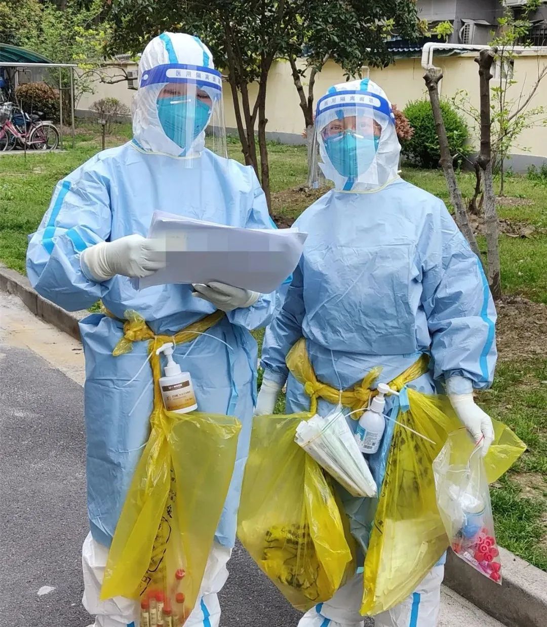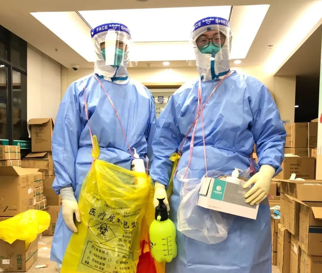 闵行区中西医结合医院核酸采样医护为了中途不往返浪费采样时间,方便采样,急中生智分门别类地把手消毒剂、试剂管等装入袋中,再用胶带绑在腰间。
