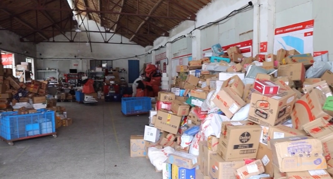 进入快件仓,小哥们进行喷液消毒的正是无数人日夜盼望着的快递。泡面、牛奶、消毒水、尿布、纸巾、化妆品……由于疫情管控,这些跨乡镇的快递件短期内被积压在了仓库,暂时无法正常派送。