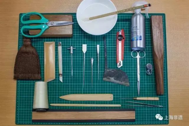 拓片修复装裱工具:裱案、棕刷、羊毛刷、毛笔、竹启、喷水壶、针锥、镊子、水油纸等。
