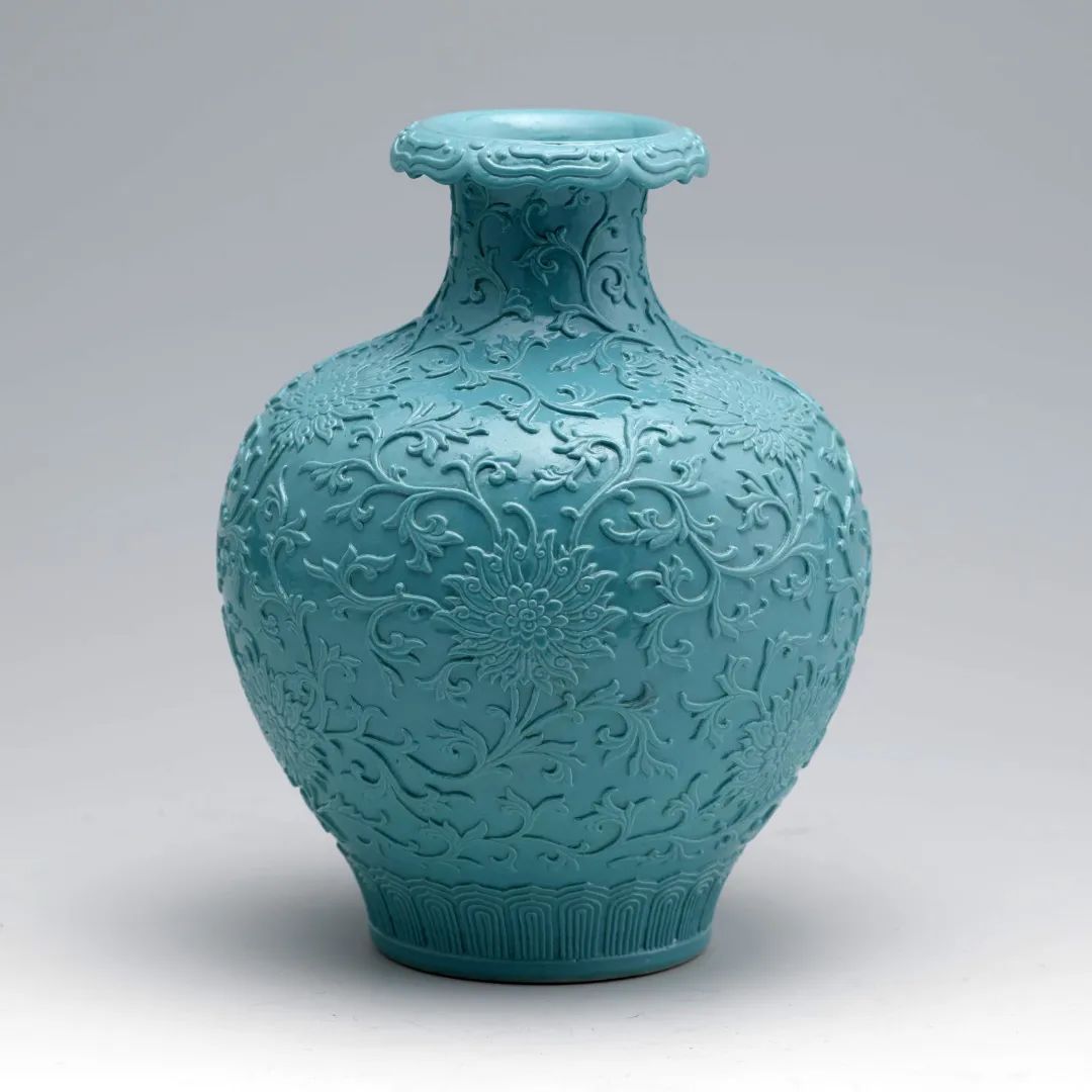 松石绿是清代雍正时创烧的一种低温绿釉,绿中带蓝,因色泽类似绿松石而得名。在雍正、乾隆两朝的官窑瓷器中不乏精品。这件松石绿釉瓶器表剔刻装饰缠枝番莲花纹,也称“西番莲纹”,是欧洲生长的一种植物的纹样,茎干匍地而生,叶五分如手掌,叶柄基脚有托,叶甚大,花朵如中国牡丹,花色淡雅,夏季开白花,至秋相继不绝,蕊平铺中心,能转动,俗称“转心莲”。