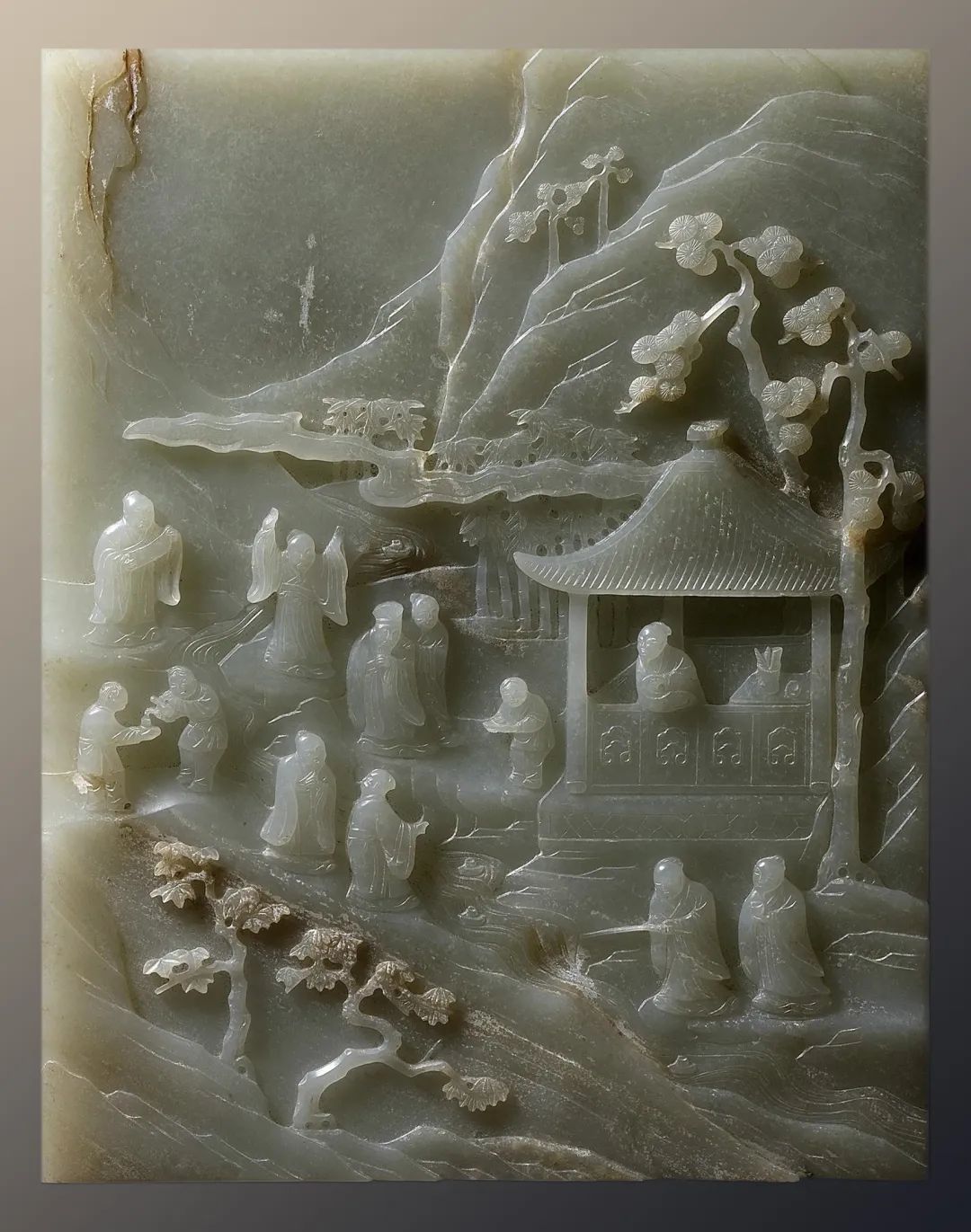 这件插屏以多层浮雕的形式表现曲水流觞的画面,在不大的面积中营造出“崇山峻岭,茂林修竹”的深邃空间,“群贤毕至,少长咸集”等盛况。工匠巧妙地利用俏色表现树叶的明暗变化,人物的安排布置也各自呼应,静中见动,表现出高超的设计、制作水准。