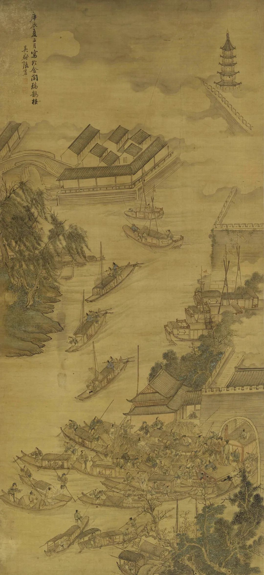 此图画苏州西门阊门内外景色,画面上方云雾中隐约可见一座高塔矗立,可能是城内的北寺塔。以此塔为制高点,正可俯瞰整个画面:护城河蜿蜒而过,左侧一带屋舍俨然,小桥穿插,左下方堤岸垂柳下停着几艘乌篷船。画面下方的水城门口聚集众多争着进出城的船只,沿城墙边还整齐停泊着一排船,远处水面上更有数船一路行来。全图描绘谨细写实,空间布置巧妙,组织得当,画面节奏动静相宜,色彩清丽不失古雅,生动地表现了苏州阊门地区优美的风景、水乡的特色和繁忙的生活场景。