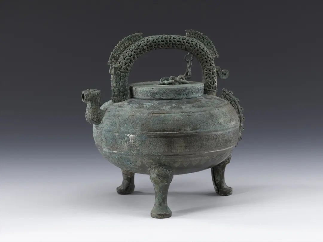 扁圆形腹,器底下接三兽首蹄形足,曲颈龙首流,与流相对一侧饰有扉棱,直口平盖,与器口相合成子母口,盖上有环钮,套铸8字形链条与提梁内侧小环相连。宽肩上设镂空龙形提梁,提梁两侧饰扉棱,中段未设,应是方便提拿。盖面与器腹纹饰满布不分首尾极其细密小龙交缠构成的蟠螭纹,与镂空的提梁相互辉映,形成了华丽缜密的视觉效果。