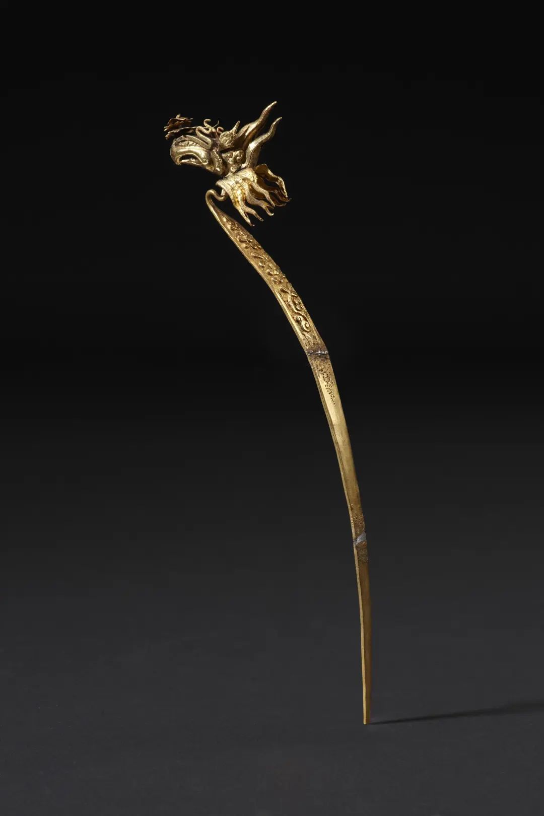 凤为鸟喙,丹凤眼,小圆睛,喙顶焊接一束花朵。凤首下焊一圆管,与簪脚套接,可以转动。簪脚扁平,以金片捶打而成,顶端s形弯头插入簪首圆管内,中部渐宽,至尾部收缩成尖形,造型弯弧舒展如彩虹。簪脚正面饰折枝梅花纹,啄糙地,以反衬主纹的浅浮雕效果。下垂针点莲纹。