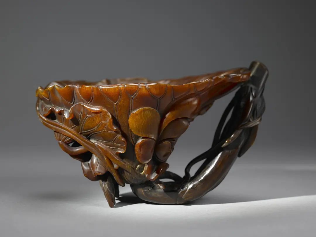 此犀杯为明代后期开始流行的荷叶杯样式,且为荷梗中空,兼具杯柄与吸管二用的把莲吸杯。这种犀杯啜饮、吸饮两宜,持之风度娴雅,最得文人青睐。作品刻画细腻,叶脉、花蕊精致传神,杯中置螳螂一只,跃跃欲动。花虫虽微,却令人想见江南荷塘秋色,构思巧妙,极富情趣。杯外侧底部有阳文篆书“尤侃”款识。