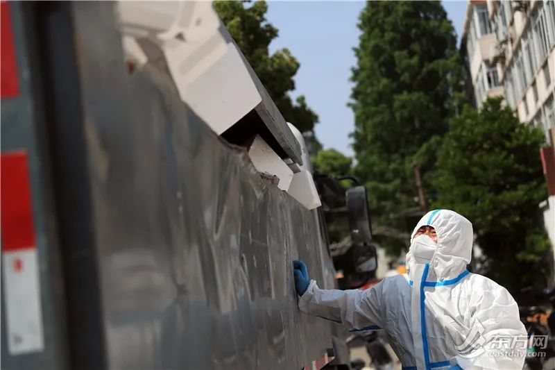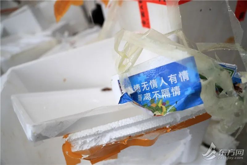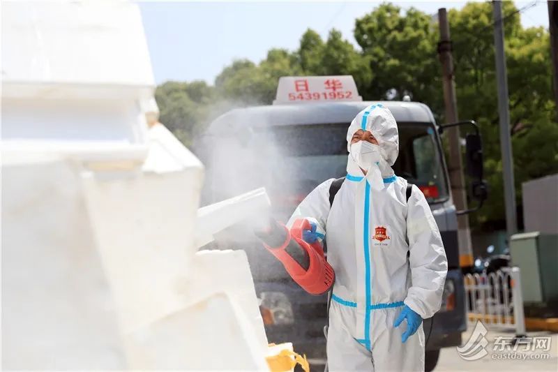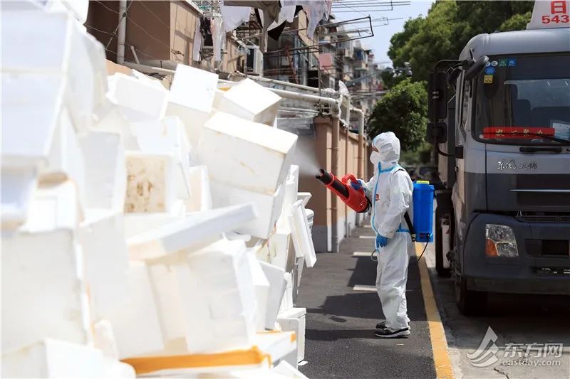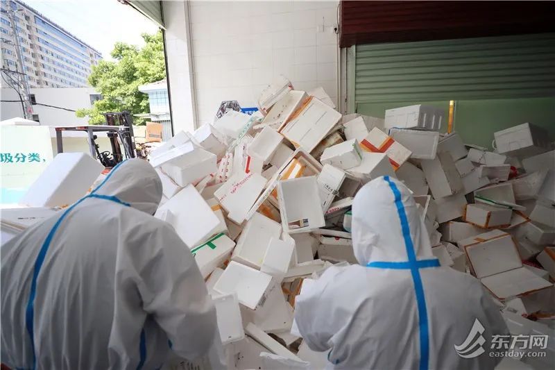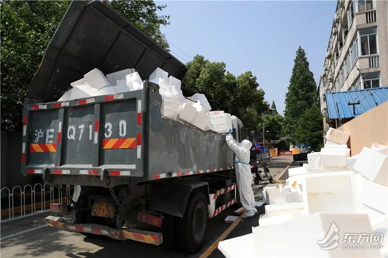 徐汇区龙华西路机场新村外,上百个泡沫塑料箱临时堆放在路边。徐汇城投集团下属上海日华保洁有限公司清道班长张磊告诉记者,“该小区昨天刚发放了一批生活物资,产生了三四百个泡沫塑料箱,物业与我们对接,先把泡沫塑料箱消毒,暂存在这个临时堆放点。我们过来进行二次消毒,装车,运到两网融合中转站。光昨天一天,我们就清运了十五六车。”