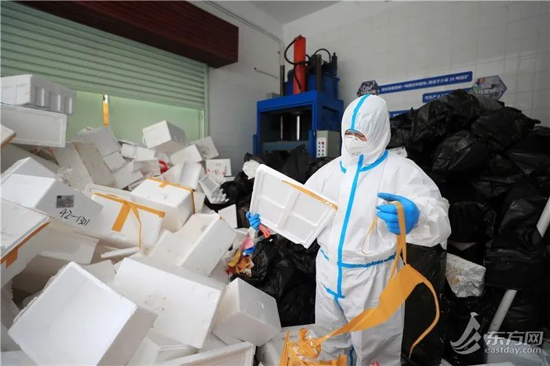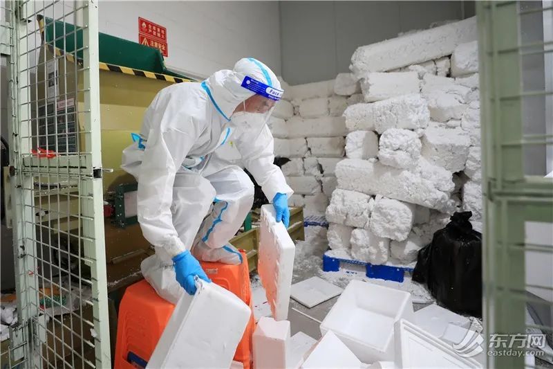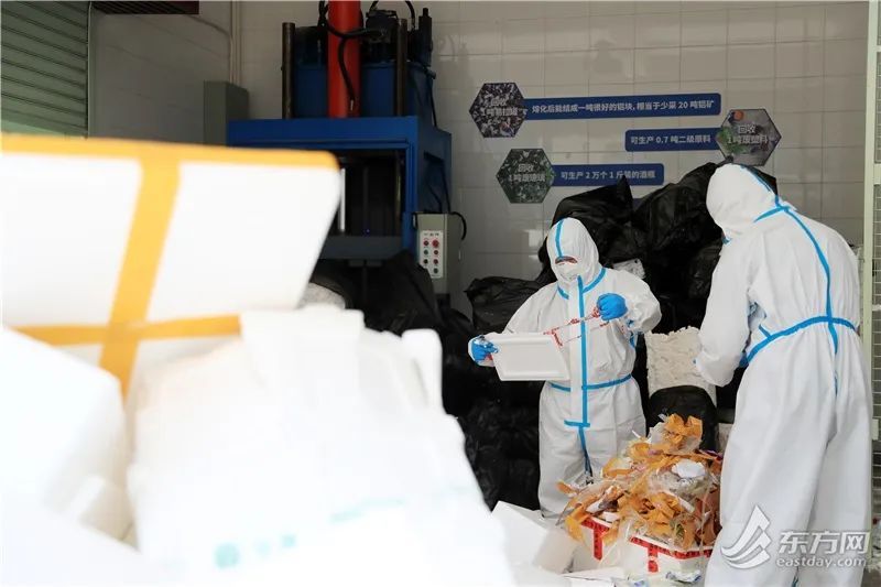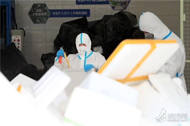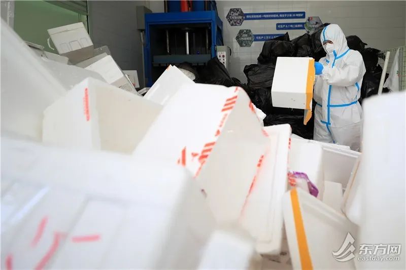 泡沫箱送至中转站后,会在消杀区进行严格消杀及静置,再由工作人员将泡沫箱经过预处理、冷压、成块、堆放,最后被送到再生资源厂进行深化加工。