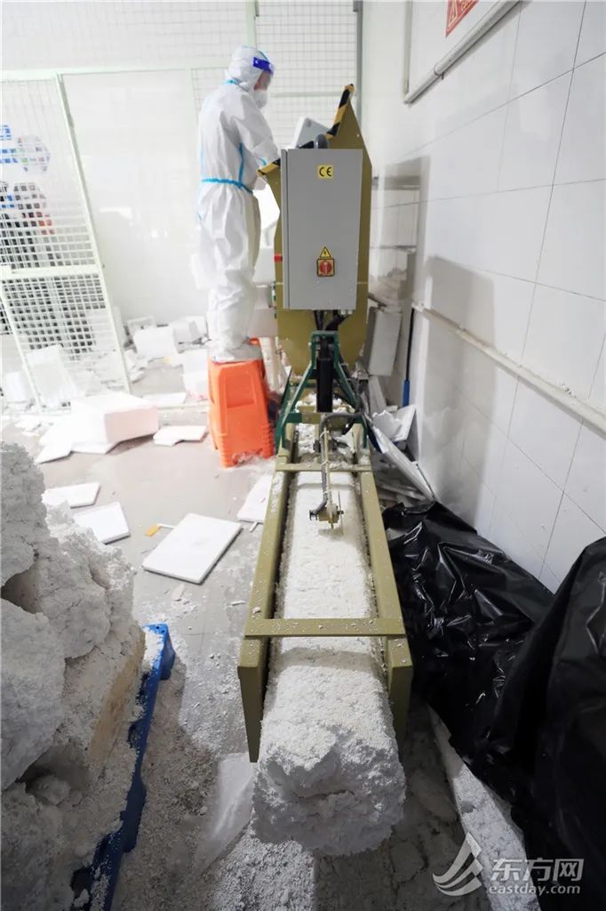 今日,记者来到徐汇区田林街道两网融合中转站,见到工作人员满负荷运作。经过预处理后,泡沫塑料箱变成一块块白色“冰砖”,最后被送到再生资源厂进行深化加工。