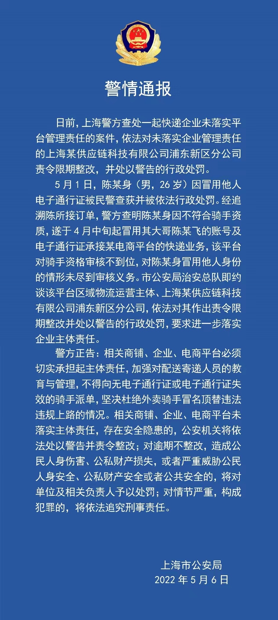 5月1日,陈某身(男,26岁)因冒用他人电子通行证被民警查获并被依法行政处罚。经追溯陈所接订单,警方查明陈某身因不符合骑手资质,遂于4月中旬起冒用其大哥陈某飞的账号及电子通行证承接某电商平台的快递业务,该平台对骑手资格审核不到位,对陈某身冒用他人身份的情形未尽到审核义务。市公安局治安总队即约谈该平台区域物流运营主体、上海某供应链科技有限公司浦东新区分公司,依法对其作出责令限期整改并处以警告的行政处罚,要求进一步落实企业主体责任。