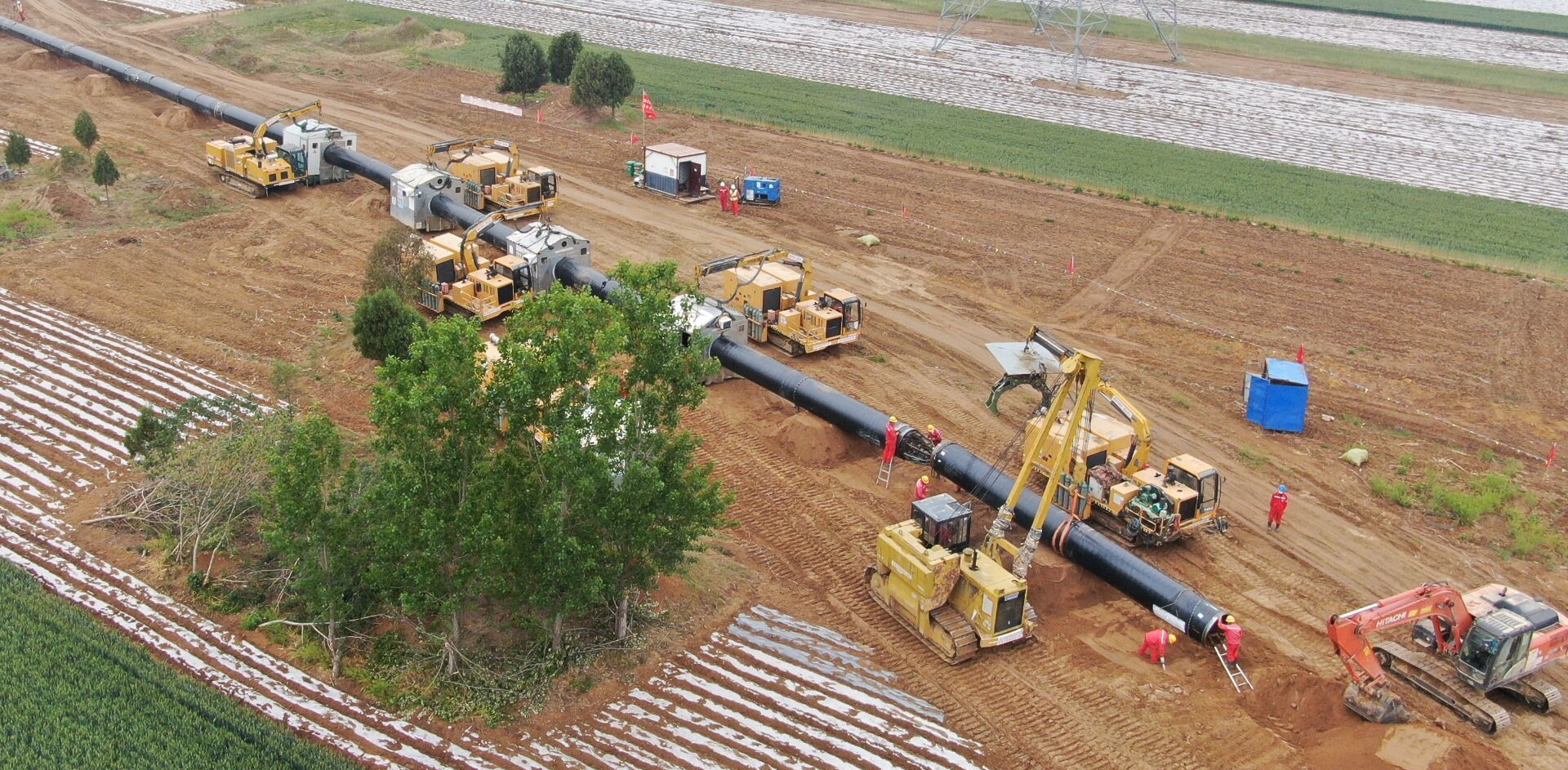 初夏,山东各地工程建设抢抓有利时机加紧施工。5月10日,山东管网东干线天然气管道工程沂南县蒲汪镇段正在吊装焊接,现场繁忙有序。(大众日报客户端记者 卢鹏 通讯员 杜昱葆 报道)