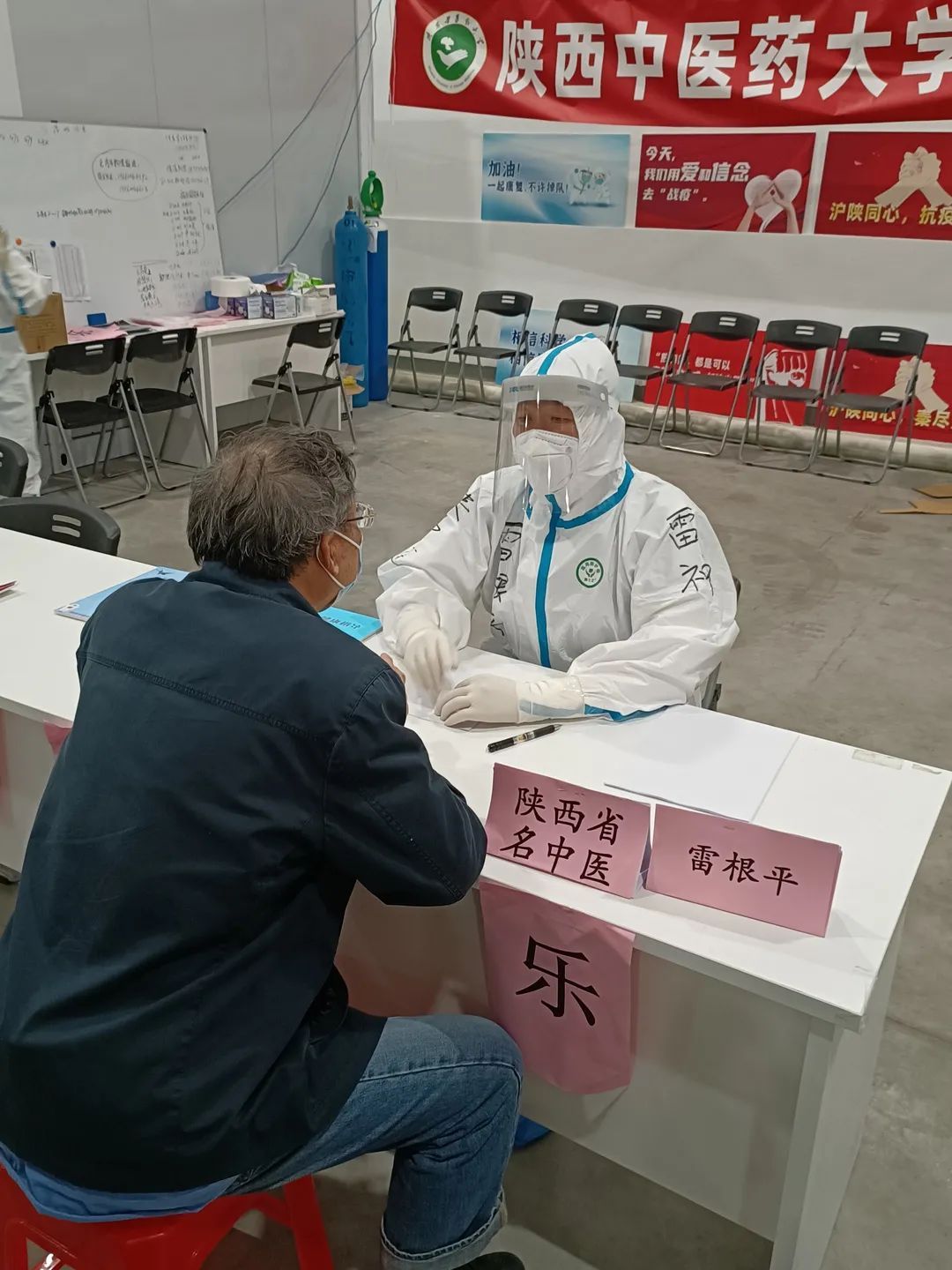 这是上海市宝山区泾灿方舱内的温馨一幕,陕西中医药大学援护医疗队队长雷根平正在方舱内为病人看诊开药。