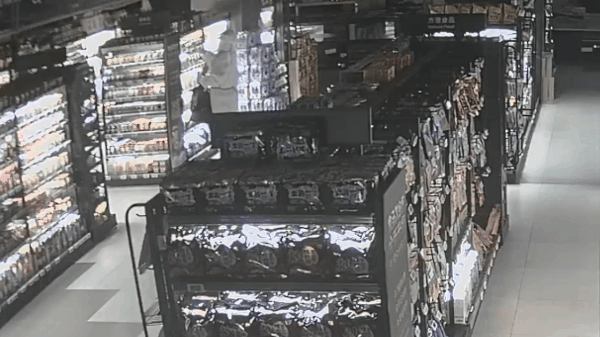 接到报案后,民警随即赶往现场展开调查,并很快在超市出入口的公共视频录像内找到了线索。画面显示,4月27日凌晨,两名身着防护服的年轻男女从超市卷帘闸门的破损处钻入店中,各自挎着黑色背包在货架、冷柜前装取商品,“扫荡”完毕后再次从破损处钻出。