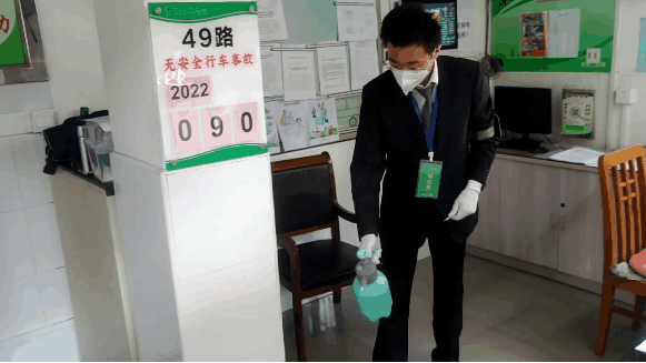 车辆营运结束后还会采取“预防+常规”的双消毒模式,回到停车场前,会有专人使用专业消毒设备对车辆进行全面喷洒消杀,停到车位后再由消毒人员使用消毒液对车厢内各部位进行擦拭消毒,确保车辆消毒工作不留死角。