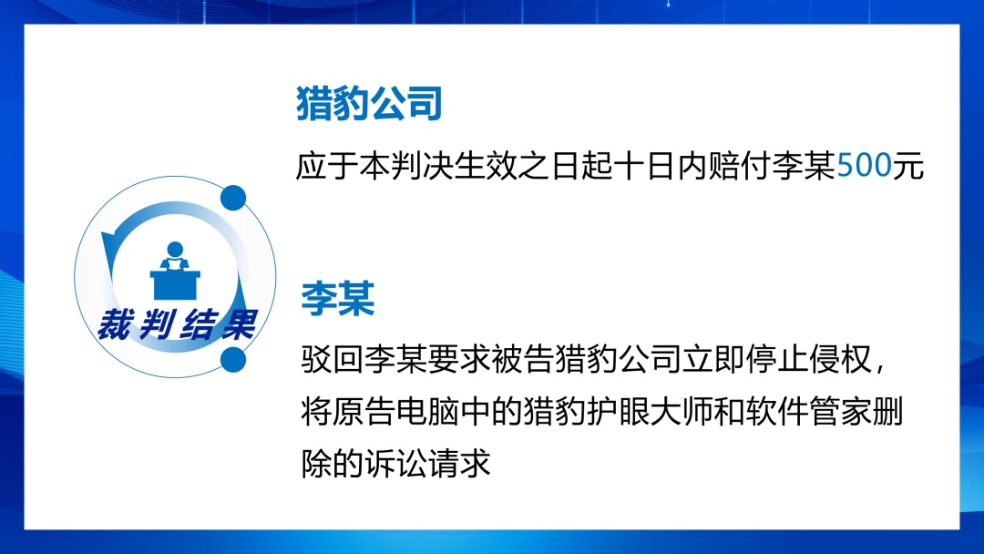 原告李某诉称,其使用自己的笔记本电脑登录被告官网,按照提示的步骤下载被告经营的金山毒霸软件产品时,被捆绑安装了“猎豹护眼大师”与“软件管家”两款软件。这些软件占用大量电脑内存,减缓电脑运行速度,并带有一定广告,严重影响原告使用电脑进行学习工作。