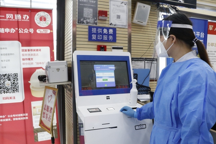 大厅门口,全新设置的“数字哨兵”集核酸查验和取号功能为一体,只需刷一下身份证,就可以在查验48小时内核酸阴性证明的同时,直接完成取号。包括“数字哨兵”在内的相关设备,都由专门的工作人员负责操作,避免了办事群众与设备的直接接触。