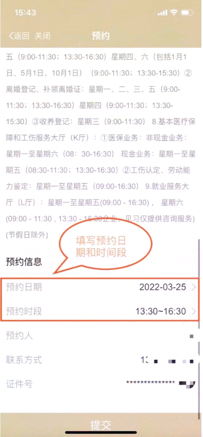 5. 选择预约日期及预约时间,信息填写完整后点击提交。