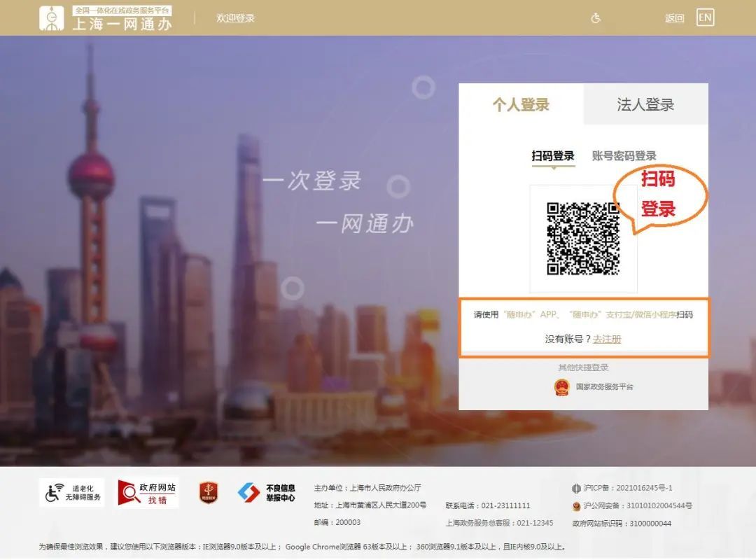 4. 使用“随申办”app、微信、支付宝“随申办”小程序扫码登录。