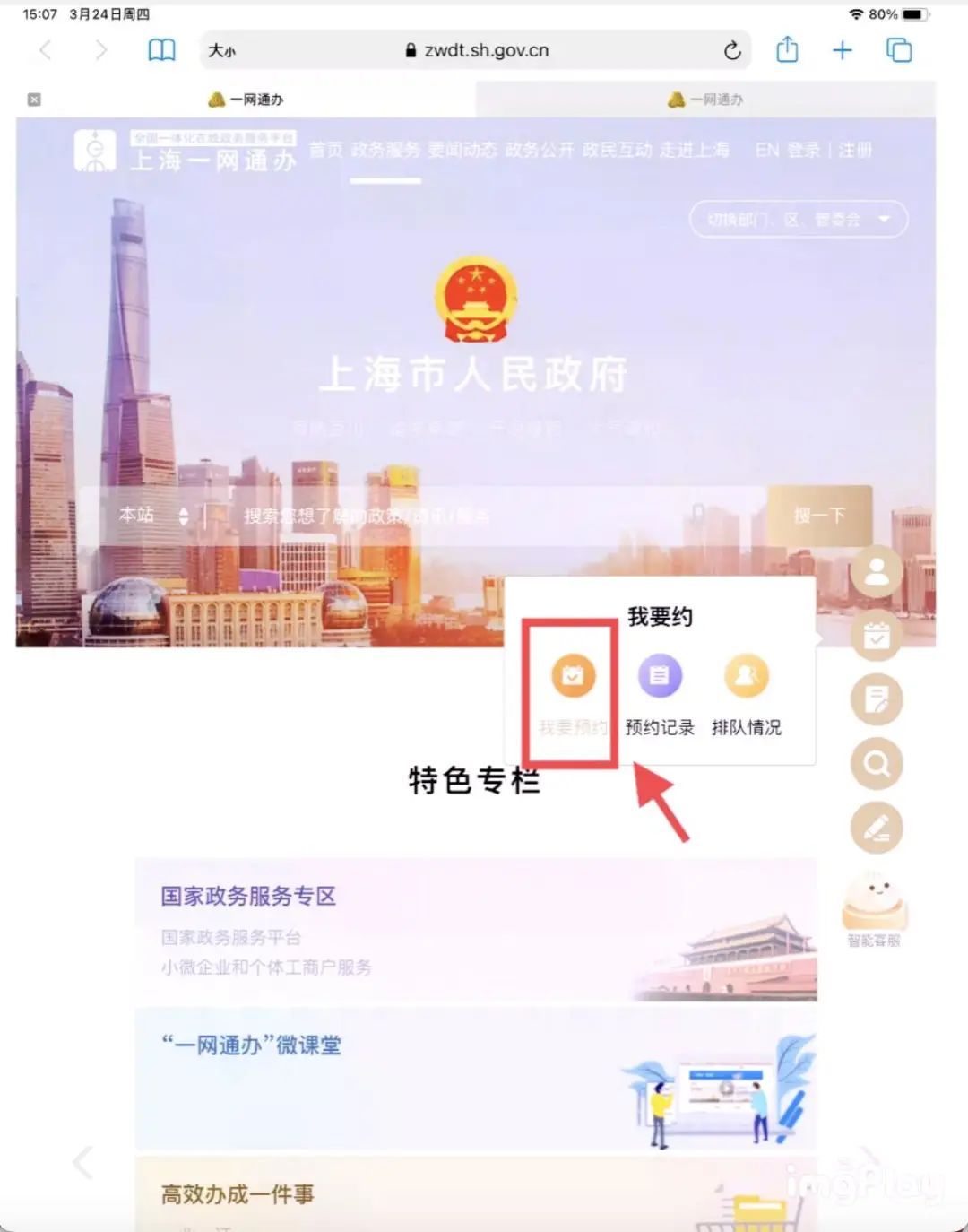 1. 进入“一网通办”主页(https://zwdt.sh.gov.cn/),网页右边快捷操作按钮点击第二个图标,点击 “我要预约”。