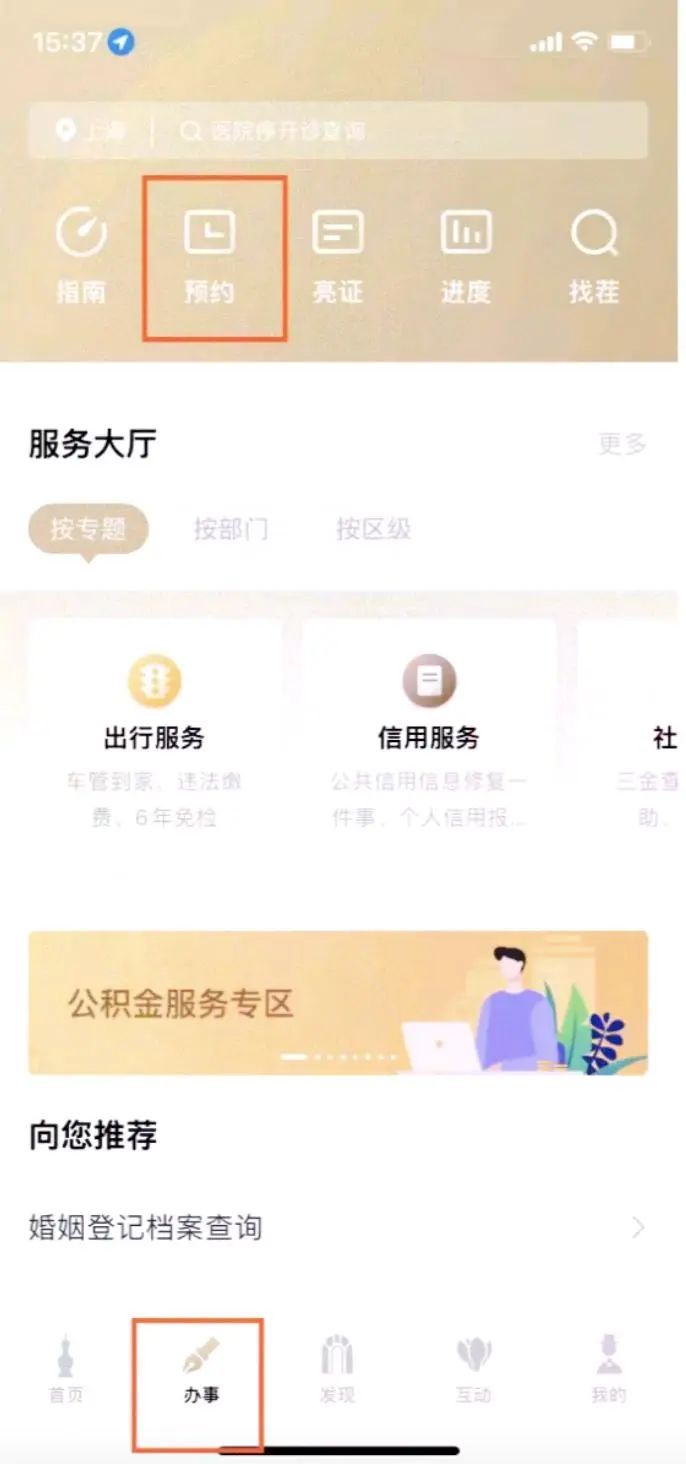 1. 打开“随申办”app、微信、支付宝“随申办”小程序,在底部选择【办事】,然后在上方点击“预约”。