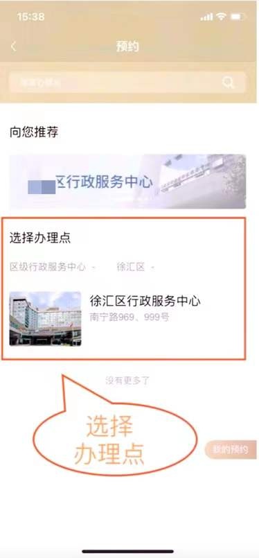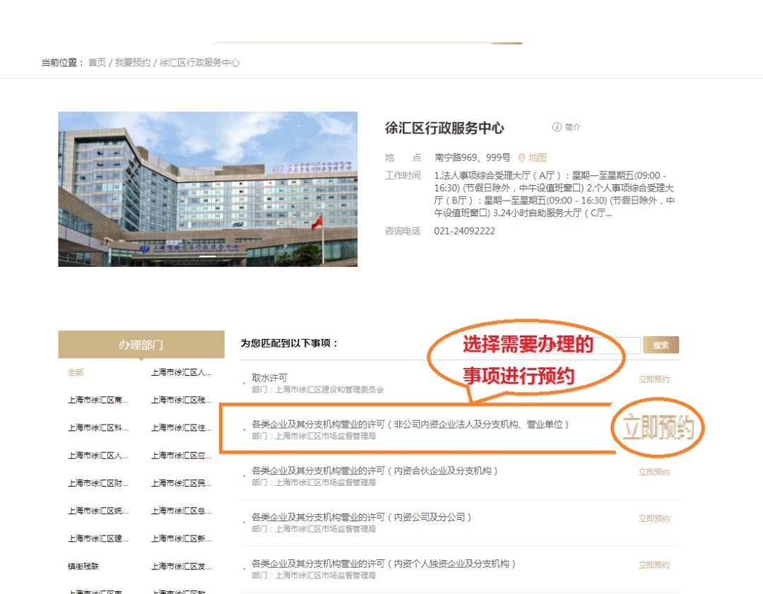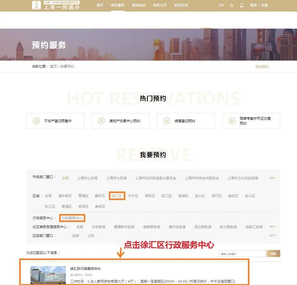 2. 区域选择“徐汇区”,然后点击 “徐汇区行政服务中心”。
