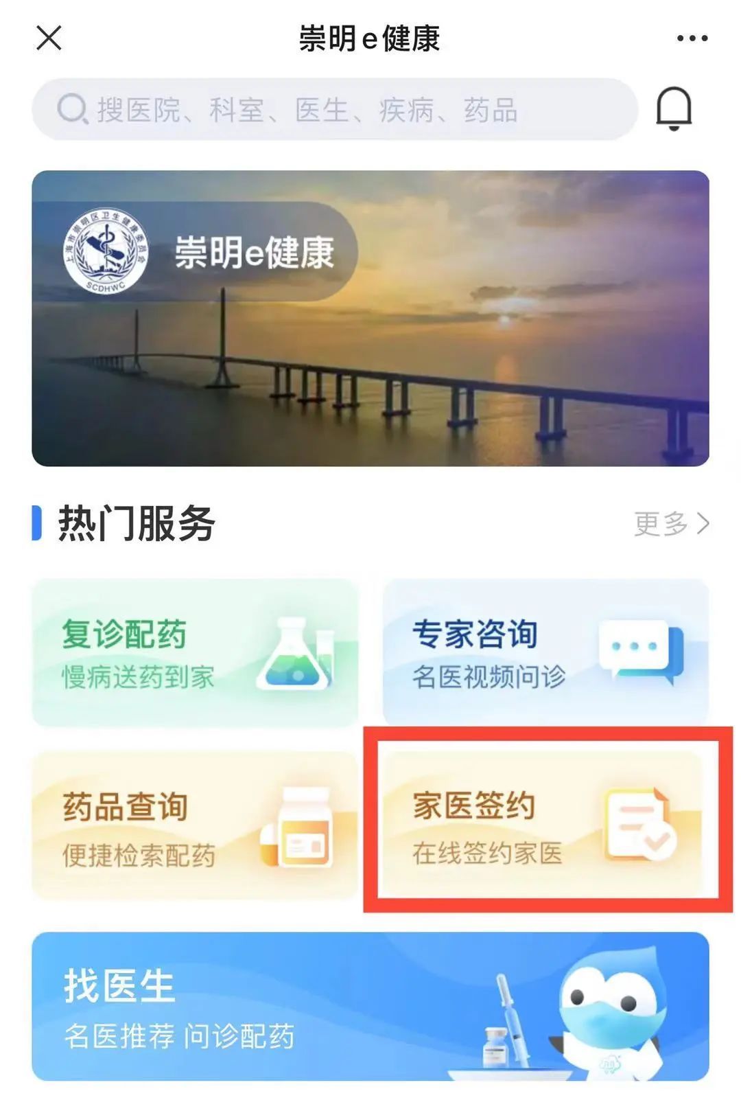 第一步:进入“崇明e健康”【互联网医院】,点击【家医签约】