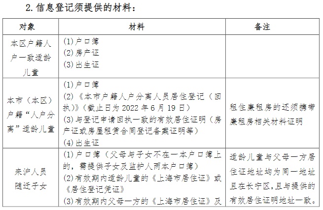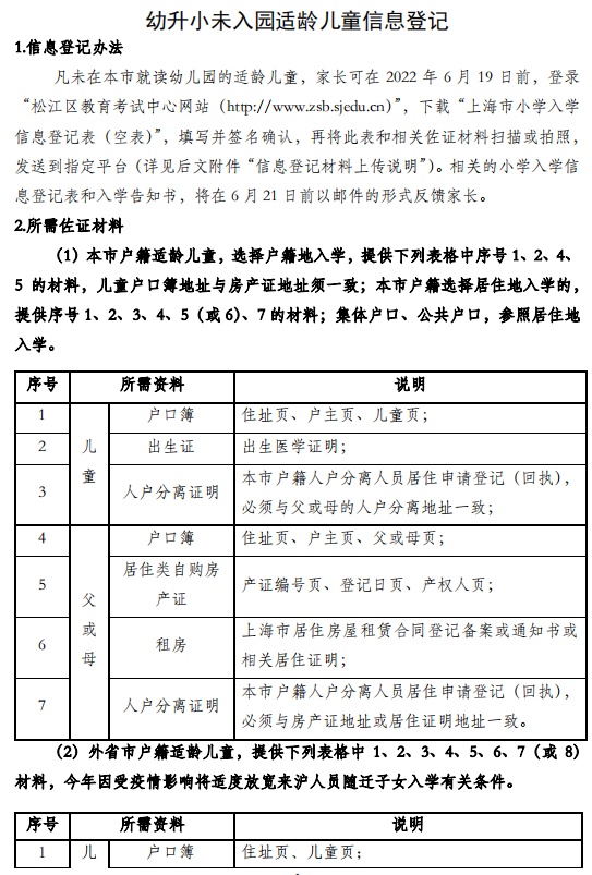 6月4日—6月19日,在园适龄儿童家长通过幼儿园登记孩子入学信息,未入园适龄儿童家长根据《2022年松江区未在本市入园适龄儿童和来沪就读六年级学生信息登记办法》,登记孩子入学信息,获取《上海市小学入学信息登记表》和“入学报名告知书”,作为入学报名的重要依据。