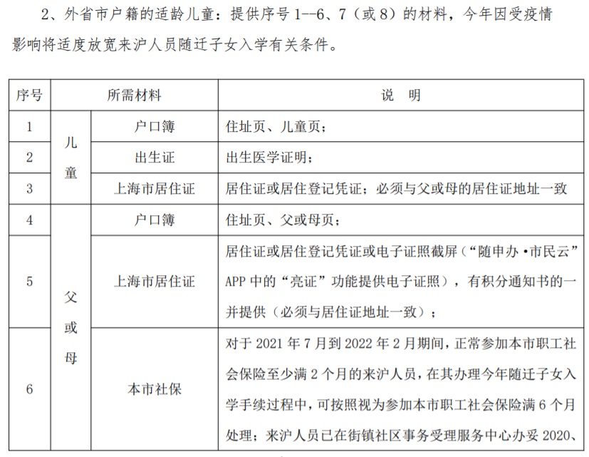 2.外省市户籍:户口簿首页、监护人页面、本人户口页面,适龄儿童《上海市居住证》或《居住登记凭证》,父母一方有效的《上海市居住证》或《居住登记凭证》、参加本市职工社会保险证明(或灵活就业登记证明)、房产证或房屋租赁备案;回沪就读六年级的学生还须提供外省市学籍信息表;