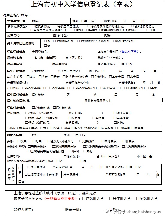 2.下载《上海市小学入学信息登记表》(空表),规范正确填写相关信息。