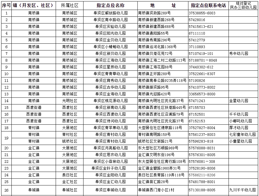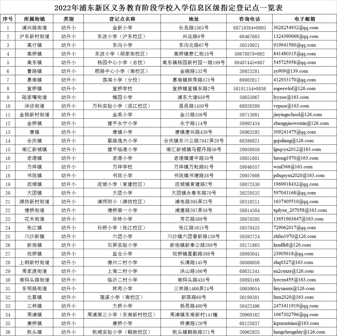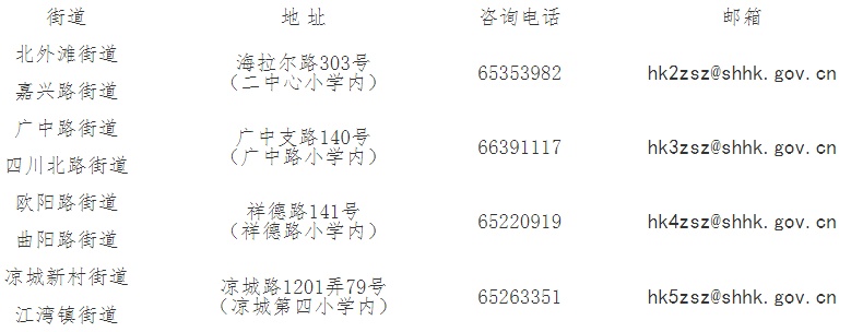 (2)家长填写“上海市小学入学信息登记表(空表)”同时需对照自身情况,将信息登记表及相关入学信息登记材料扫描或拍照以压缩包的形式发送至就读意愿镇(街道)指定登记点邮箱(邮件名称为“幼升小无备案+儿童姓名”,压缩包名称同邮件名称)。指定点咨询电话及登记邮箱见下表: