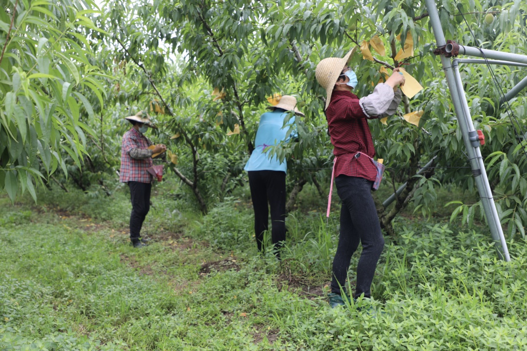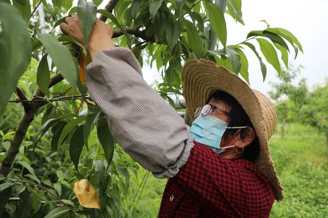 “今年人手不够,最近几天我们招了很多本地农民过来帮忙。”孙希洲说,“以前我们套袋的都是以外地人员为主,前年开始陆续培养本地农民套袋。”受疫情影响,外来人员不能过来,但时节不等人,为赶在梅雨季来临前完成黄桃幼果套袋工作,孙希洲招募了8名本地阿姨,通过培训,快速上岗。孙希洲说:“由于疫情原因,让我们意识到培养本地技术工的必要性,可以减少一些不确定的外部因素,有利于本地桃产业的稳定发展。”