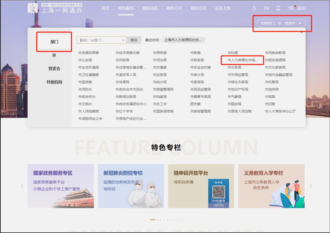 登录“一网通办”平台(https://zwdt.sh.gov.cn/),并进入“政务服务”栏目,点击“切换部门、区、管委会”,选择“市人力资源社会保障局”。