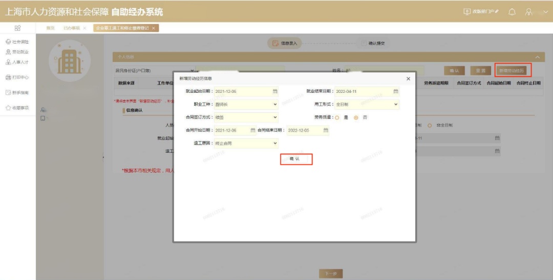 友情提醒:对于劳动经历缺失的人员,请根据界面提示信息,点击“新增劳动经历”,补全劳动经历后继续办理。