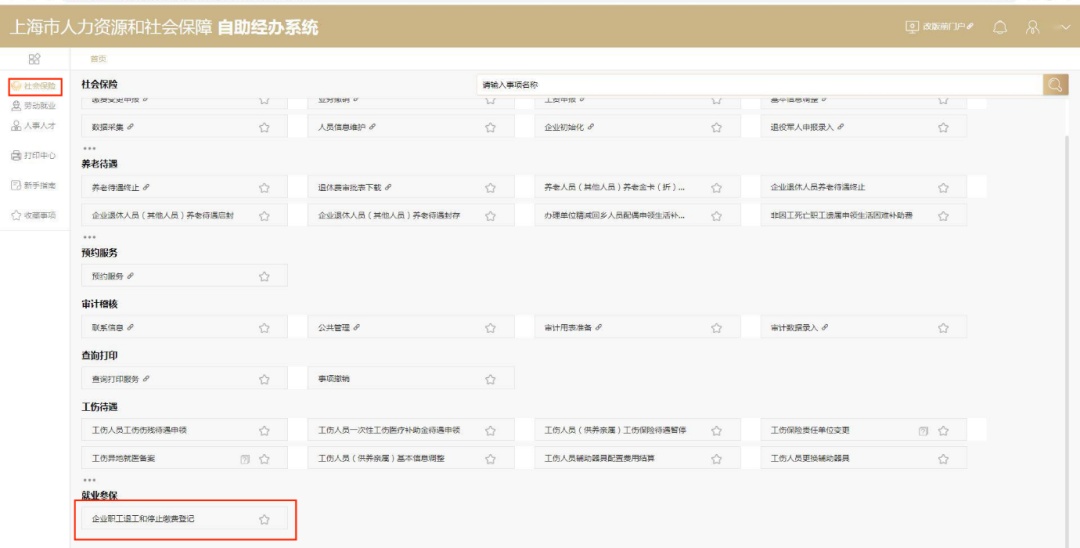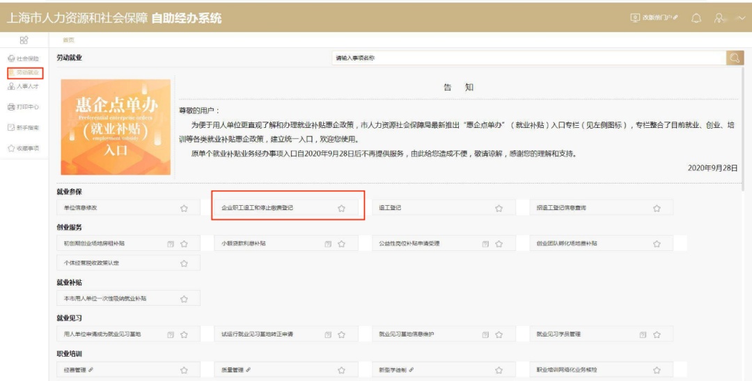 登录“上海市人力资源和社会保障自助经办系统”(https://zzjb.rsj.sh.gov.cn/zzjbdl/),进入“社会保险(劳动就业)—就业参保—企业职工退工和停止缴费登记”栏目。