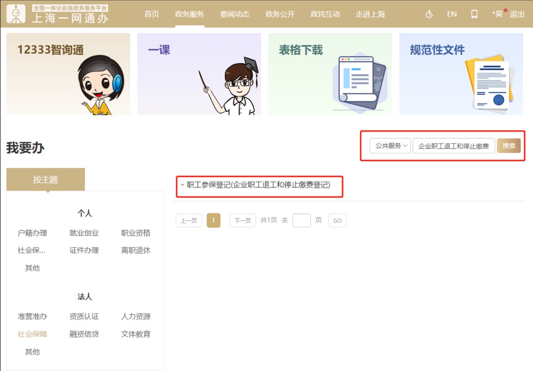 特别提示:您也可通过“一网通办”平台搜索栏输入“企业职工退工和停止缴费登记”,在搜索结果中选择正确项目进行办理。