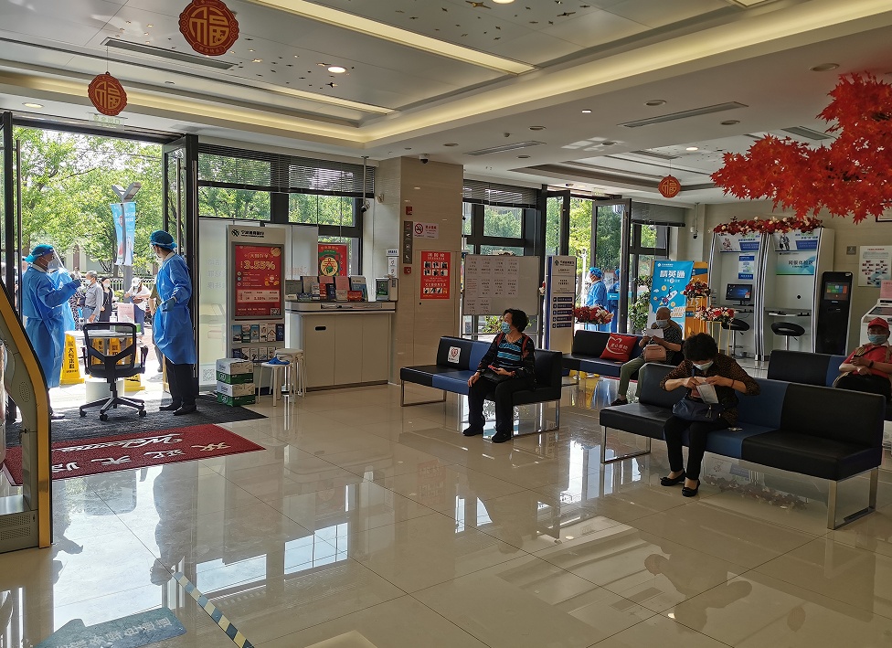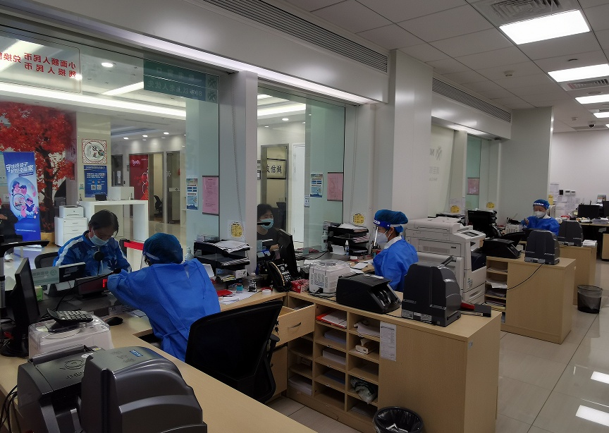 各家网点均于正式复工前制定了周密详实的复工预案,让员工和客户们吃下一颗“定心丸”。恢复营业的网点实行每日健康检测、人员登记管理、现金消毒等防疫措施,每日做好环境消杀,定期对自助设备等公共物品和设施进行消毒。为防范因聚集产生的感染风险,每个网点都明确了进出口动线,布设了“场所码”、防疫登记台和隔离帐篷,严格落实“逢进必扫、逢扫必验、不漏一人”。同时,网点根据自身厅堂布局,实时做好限流引导,设置“两米线”,控制大厅内客流数量。一线员工牢记“防疫三件套”“防护五还要”,身着防护服,佩戴n95口罩、手套和防护面屏,耐心服务每一位客户,保障业务的有序办理。