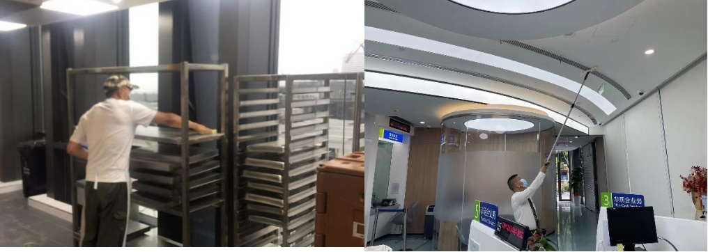 正式复工前,分行对所有办公区域逐层、逐区提前做好清洁消杀,工作人员特别对长期封闭区域,以及食堂餐厅等员工切身相关的重点区域做好全方位清洁消杀,让员工能放心办公后顾无忧。
