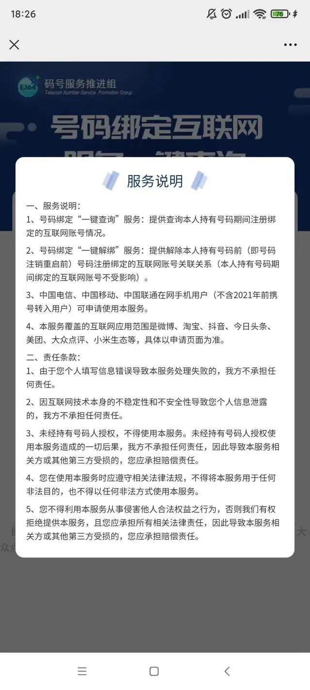 号码绑定“一键查询”服务提供查询本人持有号码期间注册绑定的互联网账号情况;