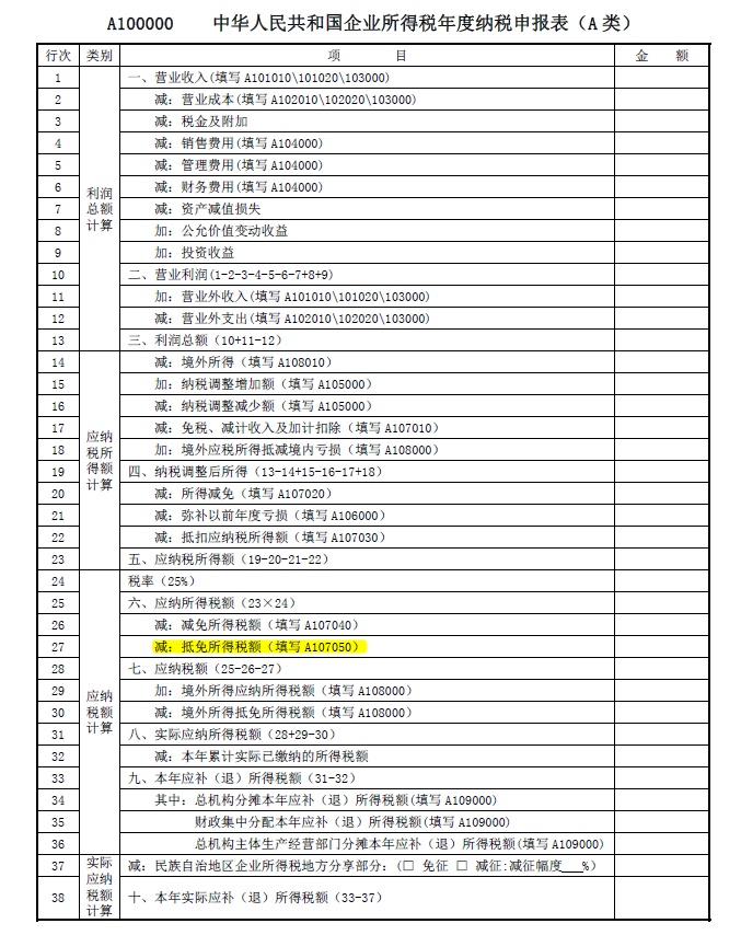 汇算清缴时,填写在主表的27行“抵免所得税额”(这一行次需要填写a107050《税额抵免优惠明细表》)。