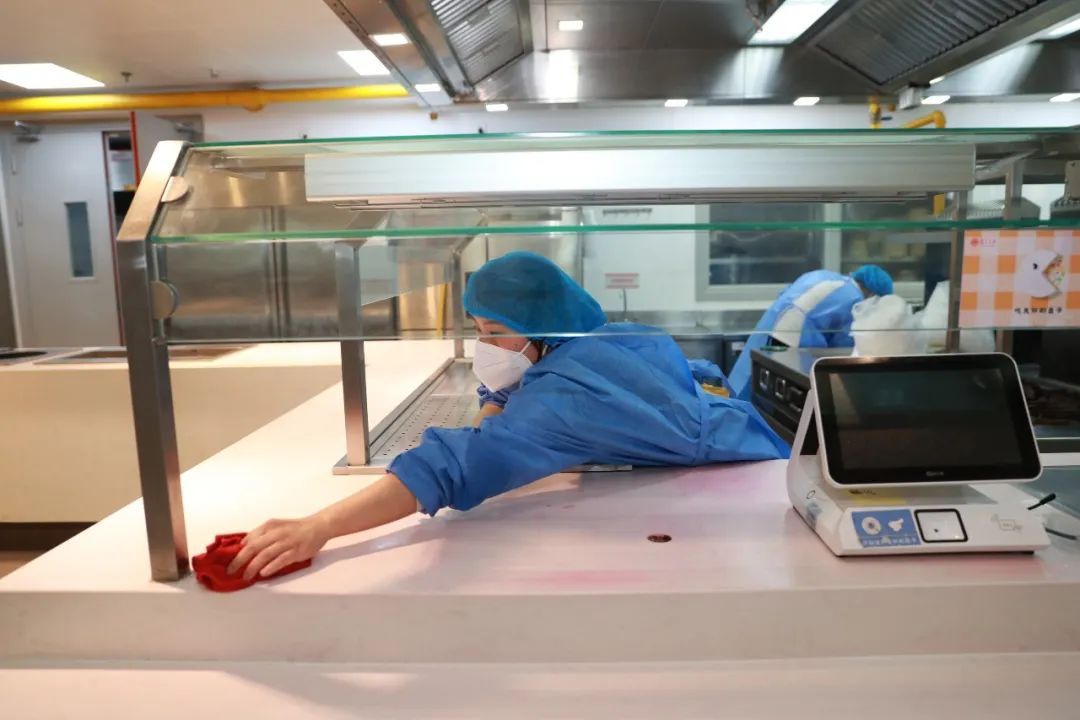 当师生开始享用晚餐时,食堂前厅后厨师傅正在用酒精擦拭着手部常接触的门把手、台面、水龙头等地方。