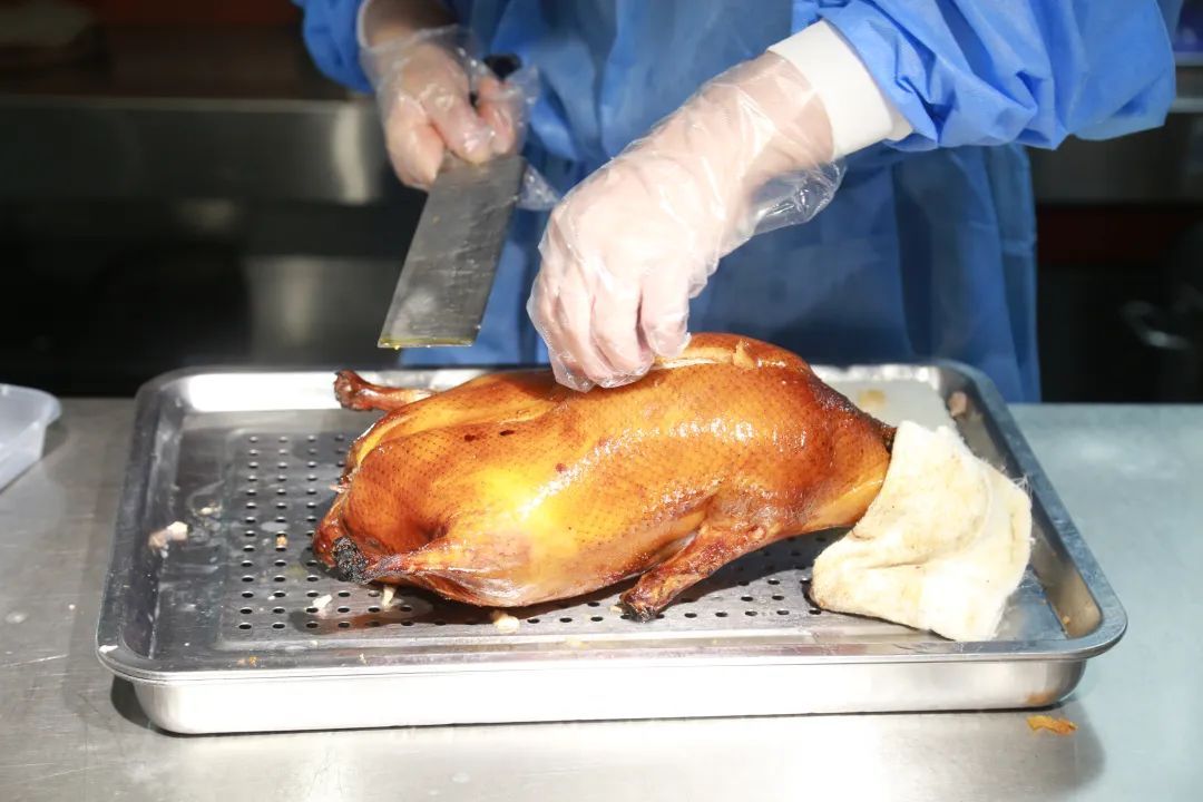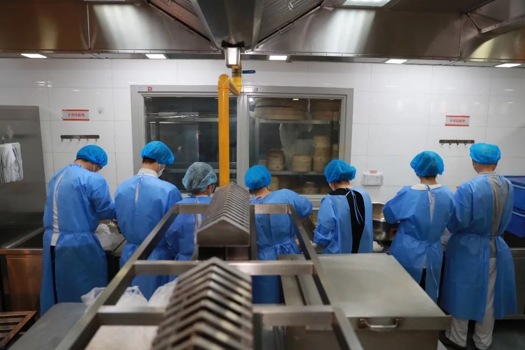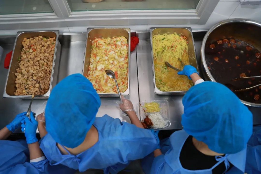 从后厨到前厅,要经过二次更衣室,除了遵循七步洗手法、进行全身消毒外,分餐组也会换上前厅专用服装。刚出炉的饭菜还冒着热气,装餐、盛饭、扣盖、装箱,菜肴从出餐至打包,严格控制在1小时内。