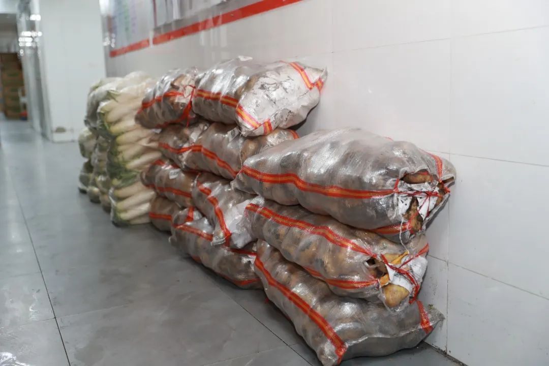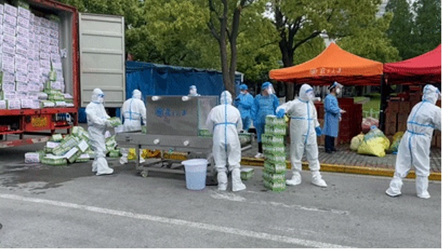 成吨的物资由卸货组成员搬下后,会对物品再进行六面消杀,蔬菜等没有外包装的食材使用紫外线灯消毒,并静置半小时以上,再搬运到指定存放地点,最后再对卸货区环境和使用物品消杀。