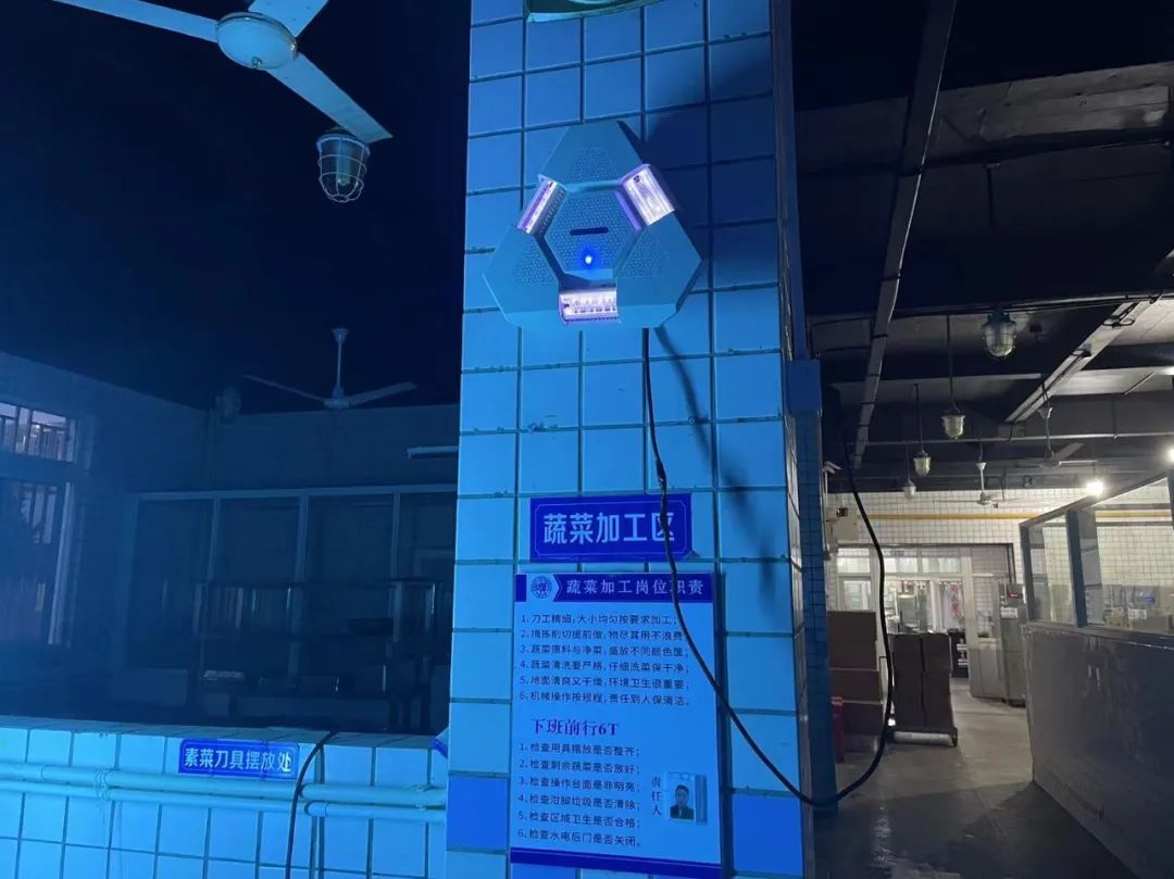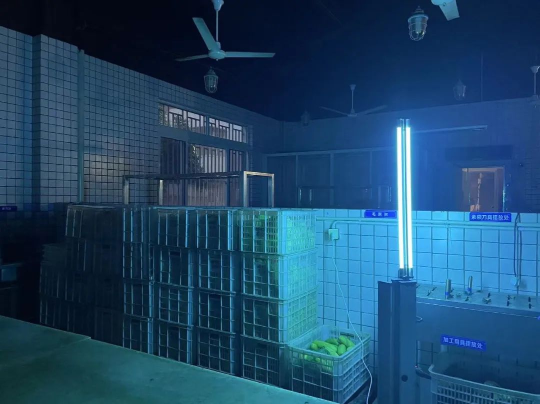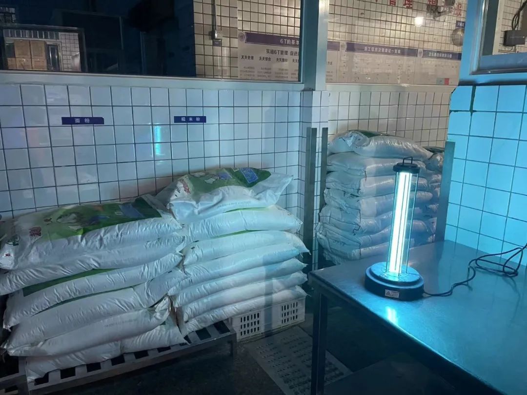 近期,学校也在不断添置防疫科技产品助力消杀,卸货区和粗加工区域添置了远紫外杀菌灯,在菜品存储区和面点区也放置可移动紫外线灯,科技赋能,让消杀无死角。