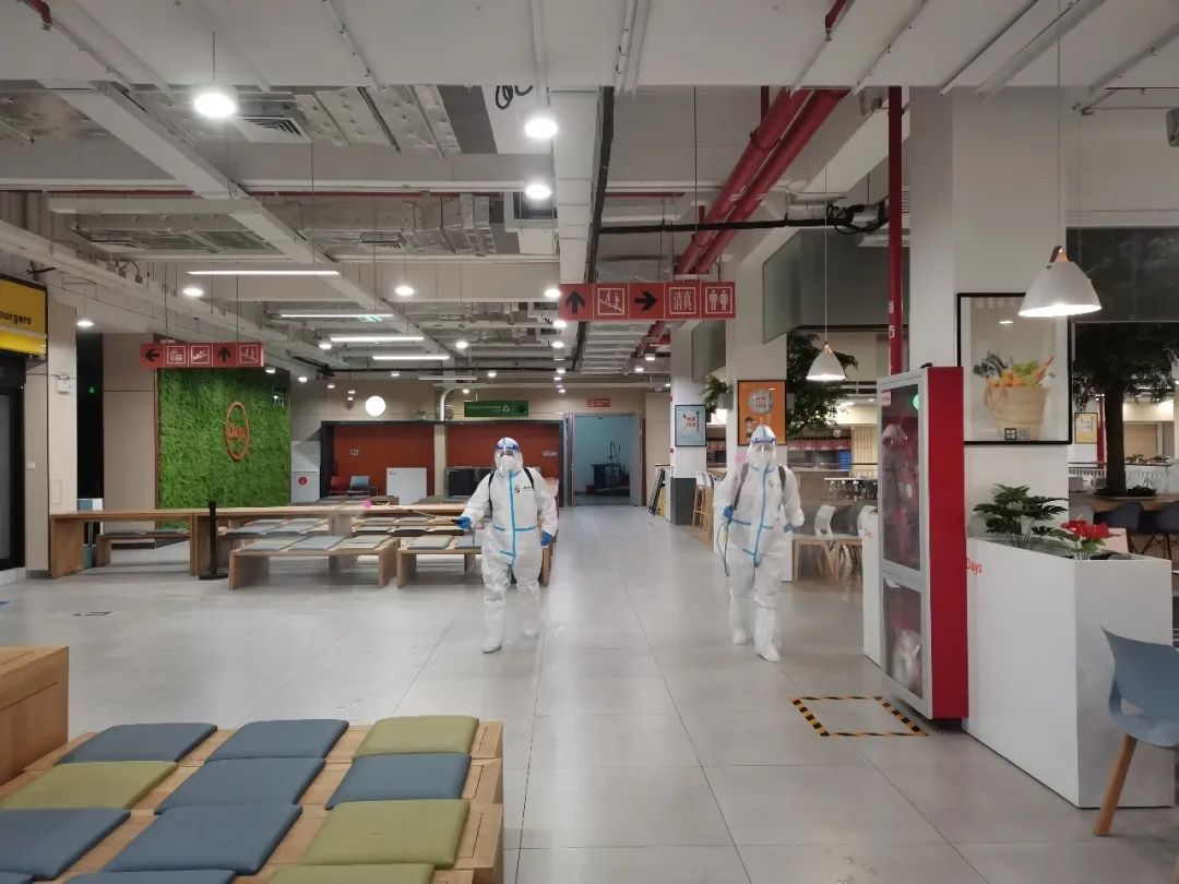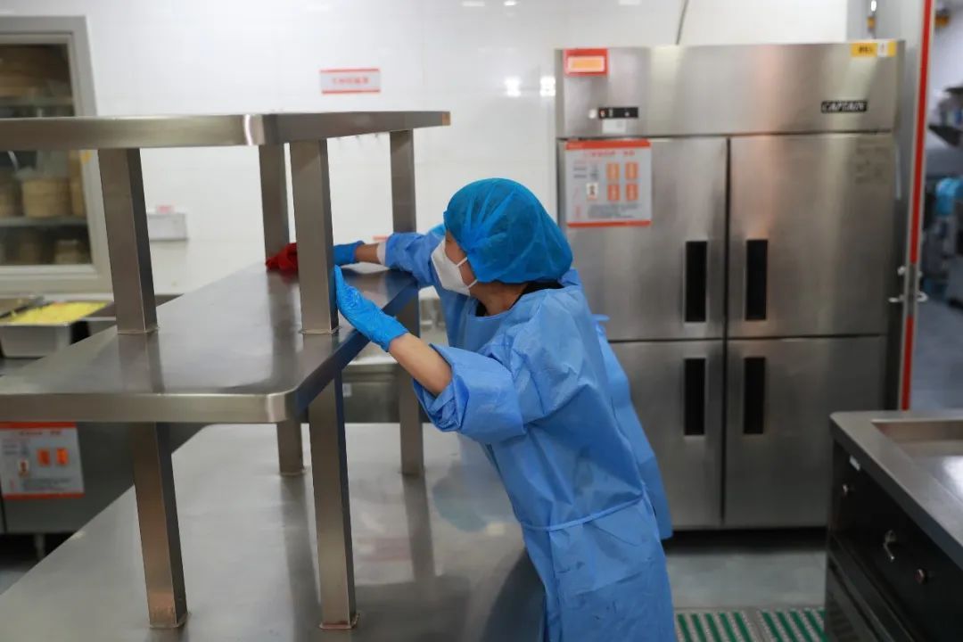 为减少风险,食堂每日进行四次消杀。穿着防护服、佩戴手套、n95 口罩和护目镜,背上背负式喷雾器,食堂消毒人员对大厅、楼梯间、垃圾桶等公共区域和设施进行喷洒消毒。