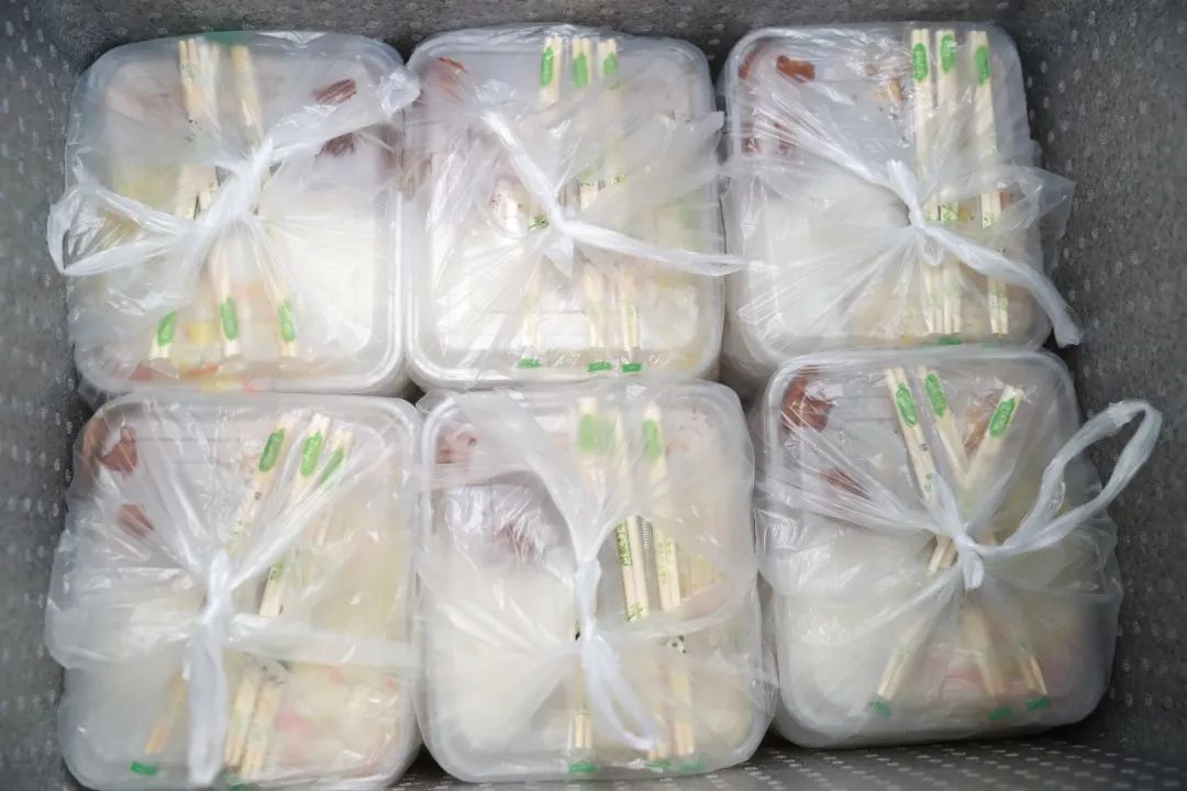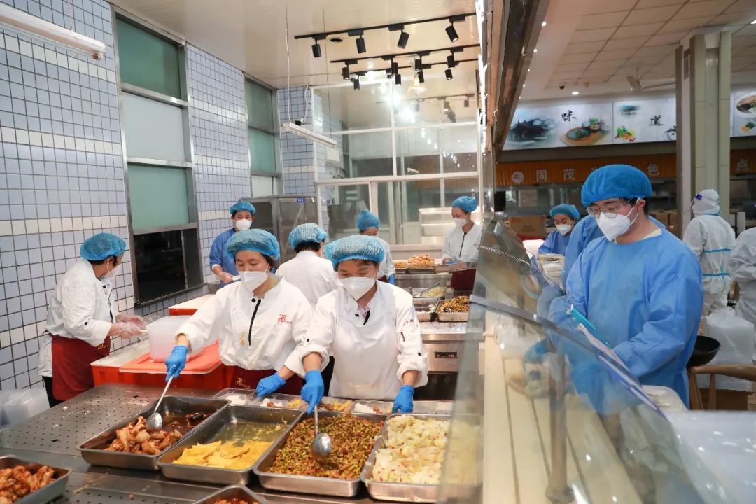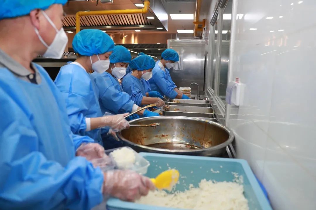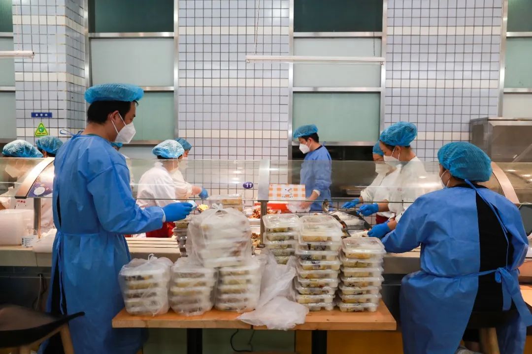 “南区31号楼,普餐198份、清真餐10份”,“已备齐,这里拿”。前厅,分餐组装箱不停,后厨,烹饪组炒制不断,同步运转,条线清晰,分工明确。出锅、装箱、接货、配送,食堂与青年志愿者的配合也越发默契。封控期间,从餐食出锅到配餐到楼,两小时内新鲜可口的饭菜就会到达师生面前。