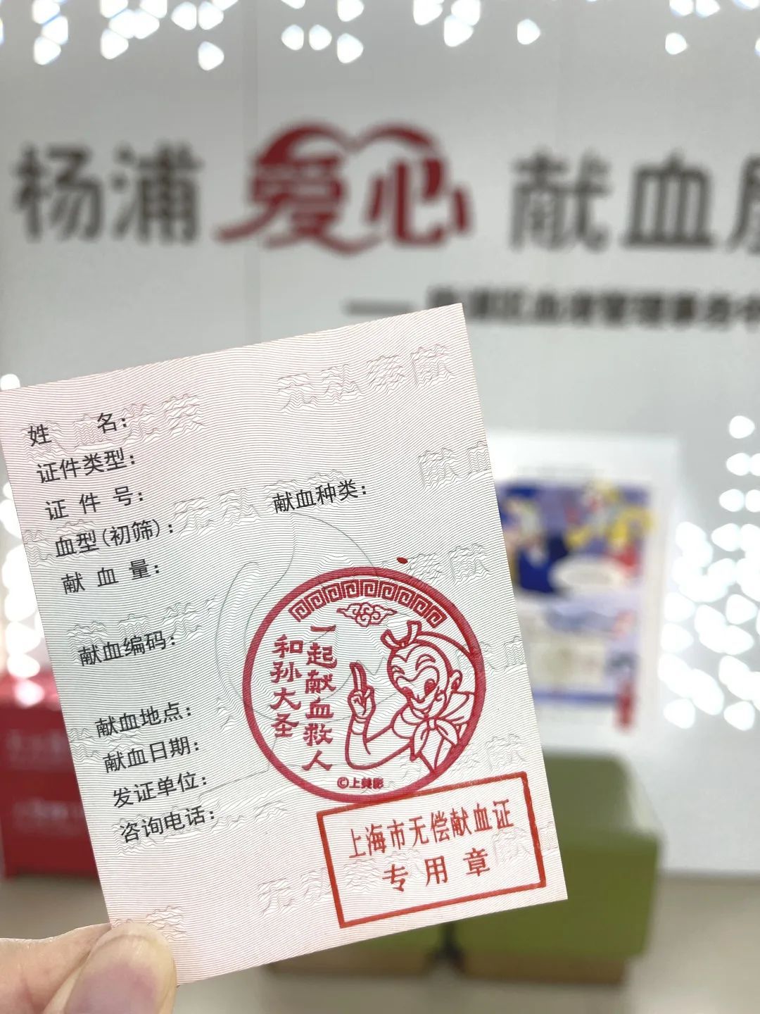 上午十点半,上海应用技术大学学生吴逸伦特地赶到杨浦区的翔殷献血点,捐献血小板。工作人员为他在献血证上盖上一个“齐天大圣孙悟空”的限定款印章。