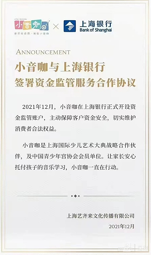 谈到当初为何选择小音咖,多位家长都提到,2021年12月,小音咖曾宣传:“已经在上海银行正式开设资金监管账户,主动保障客户资金安全,切实维护消费者合法权益。”这让家长们觉得这家机构有保障。