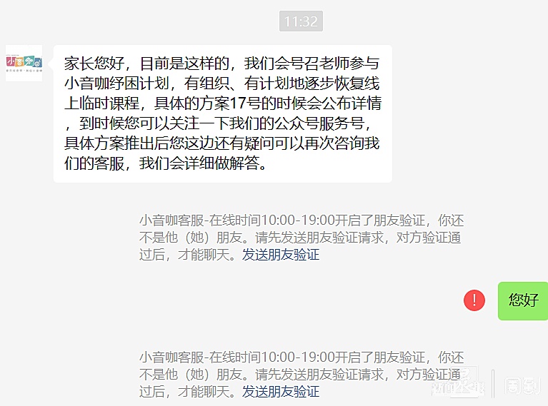 长时间联系不上小音咖的家长们,把希望寄托于“答疑热线”,可结果却让他们大失所望。6月15日,小音咖微信公众号发布了4条教师服务热线和7条学员服务热线。可是,家长们一遍遍拨打后,却发现这些热线电话不是处于关机状态,就是提示正忙。家长们又尝试添加热线的微信,谁知,对方只是机械性地回复称,小音咖已经启动“纾困计划”,方案会在(6月)17日公布。随后,许多还想进一步咨询的家长就发现,自己已经被拉黑了。