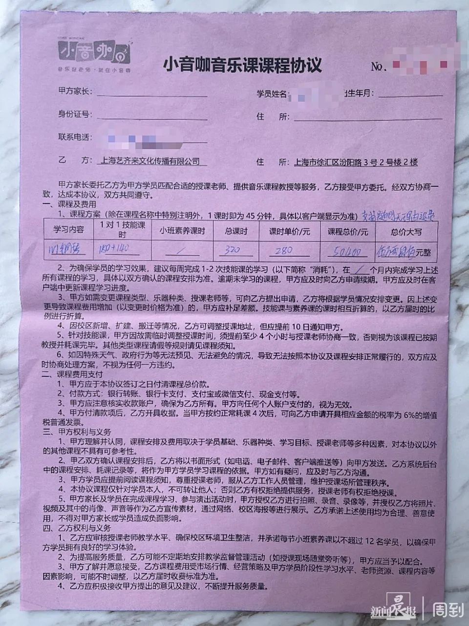 “才上了4节课,就没办法继续上了……”今年4月,市民苏女士(化名)为孩子在由上海艺齐来文化传播有限公司(以下简称“艺齐来”)经营的知名音乐教育机构小音咖报名了音乐课程,缴费一万五千余元后,才上了4节课,就被负责对接她的顾问告知“班主任联系不上了”。