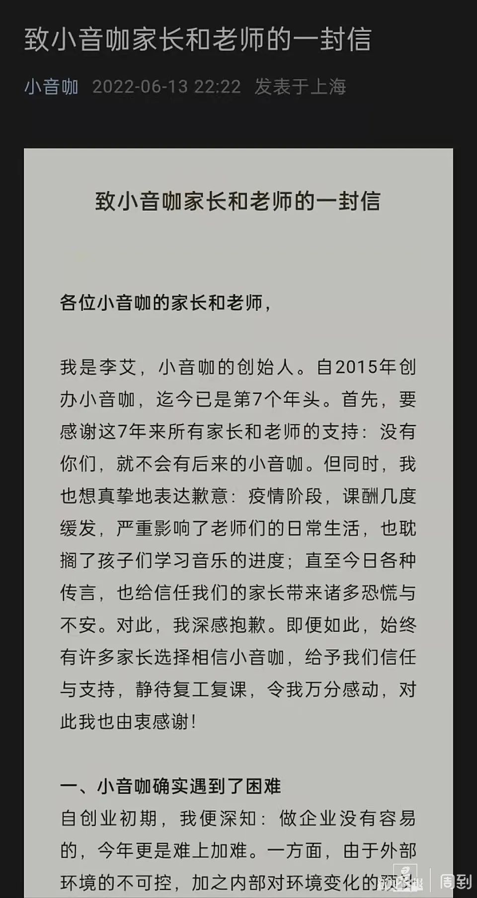 6月13日,小音咖创始人李艾在小音咖官方微信公众号上发布了《致小音咖家长和老师的一封信》,承认:“由于外部环境的不可控,加之内部对环境变化的预计不足,小音咖目前资金紧张、运营困难……”但也提到,会积极解决困难,并于6月15日起启动服务及答疑热线。